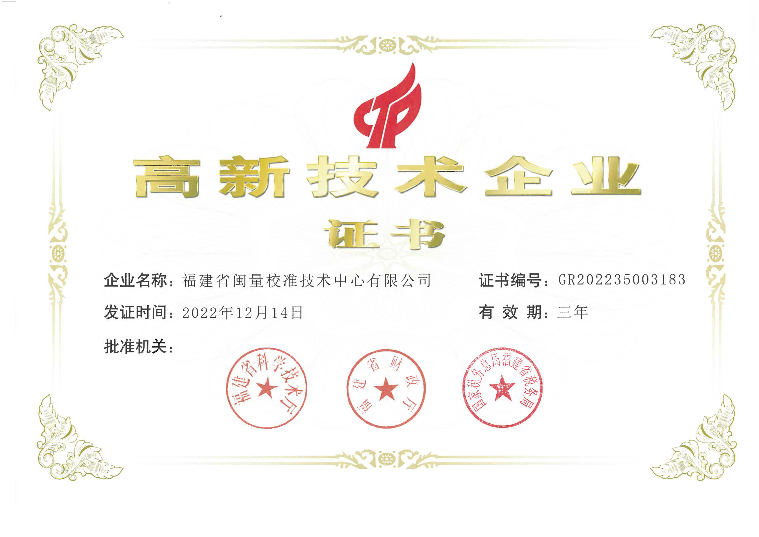 国家级高新技术企业证书证书